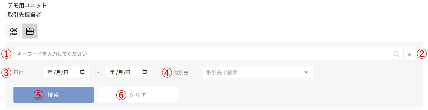 | 検索条件の取引先に検索したい取引先が表示されない | 取引先が登録されていません。取引先登録画面から登録をしてください。 |