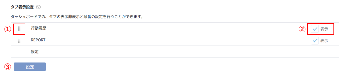 | 設定ボタンを押したのに変更内容が登録されない | 変更する項目に応じた設定ボタンを押下されていない可能性があります。タブ表示設定を変更する場合、行動履歴検索条件内の設定ボタンを押下しても変更内容は登録されません。 |
