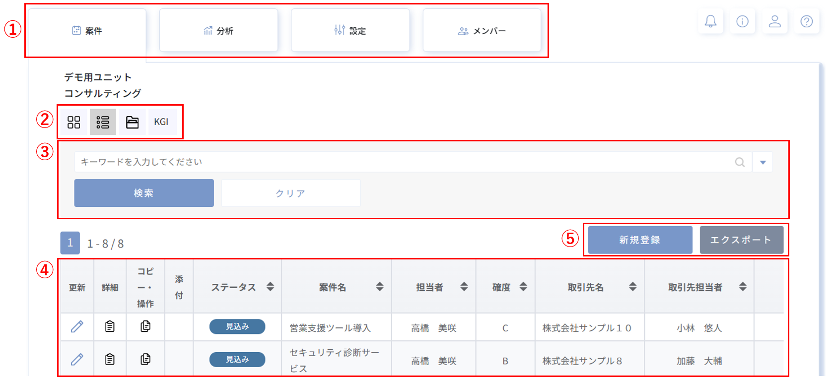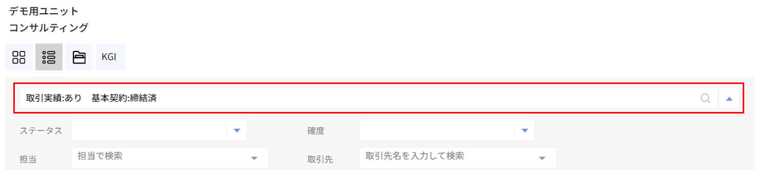 | ステータス・案件名・担当者・確度・取引先名・取引先担当者・売上・契約種別 | ヘッダーの△▽ボタンを押下することで、表示順を変更することができます。△は昇順、▽は降順になります。 |