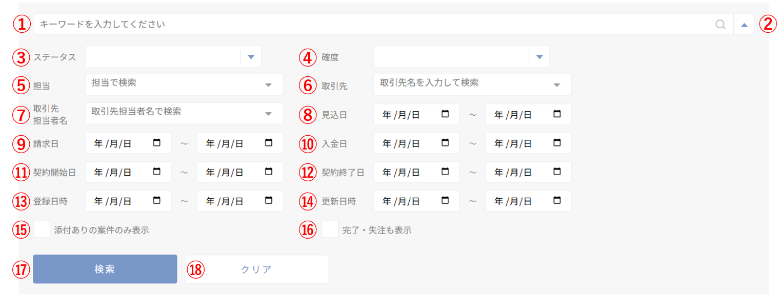 | セレクトボックス | 「タイトル名:項目の名称」、または「項目の名称」と記載することで検索ができます。指定した項目の名称が選択されている場合、検索結果に表示されます。 | 例1)申込経路:Web広告 例2)Web広告 |
